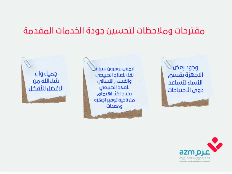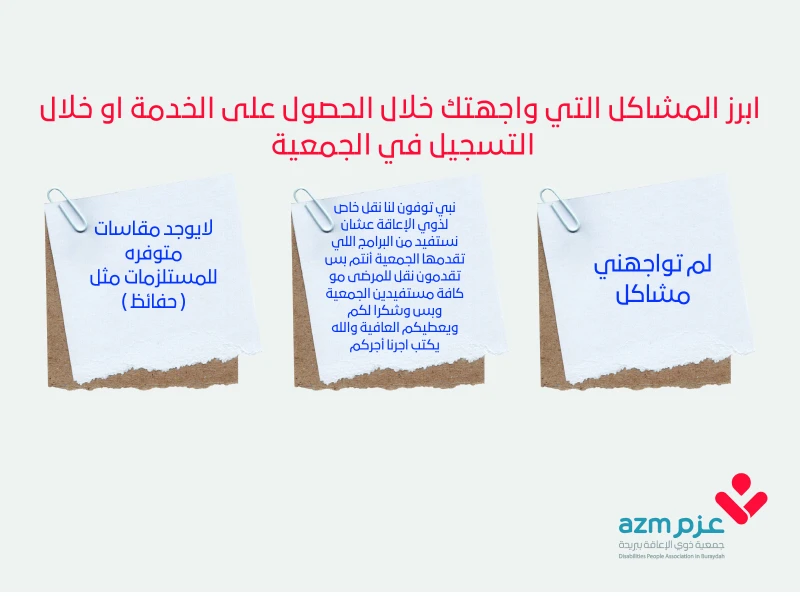 جمعية ذوي الإعاقة ببريدة عزم ترخيص رقم. 563 تأسست جمعية ذوي الإعاقة ببريدة ” عزم ” عام 1431هـ ورقم تسجيلها (563) فكانت أول جمعية خيرية تخدم الأشخاص ذوي الإعاقة في مدينة بريدة وما حولها، وتسعى إلى توفير كل الخدمات التي من شأنها أن تخدم ذوي الإعاقة، كما تحرص على الارتقاء بكافة ما تقدمه لذوي الإعاقة من خدمات وأنشطة وبرامج وفق رؤية 2030. للشكاوى والاقتراحات والملاحظات info@azem.org.sa